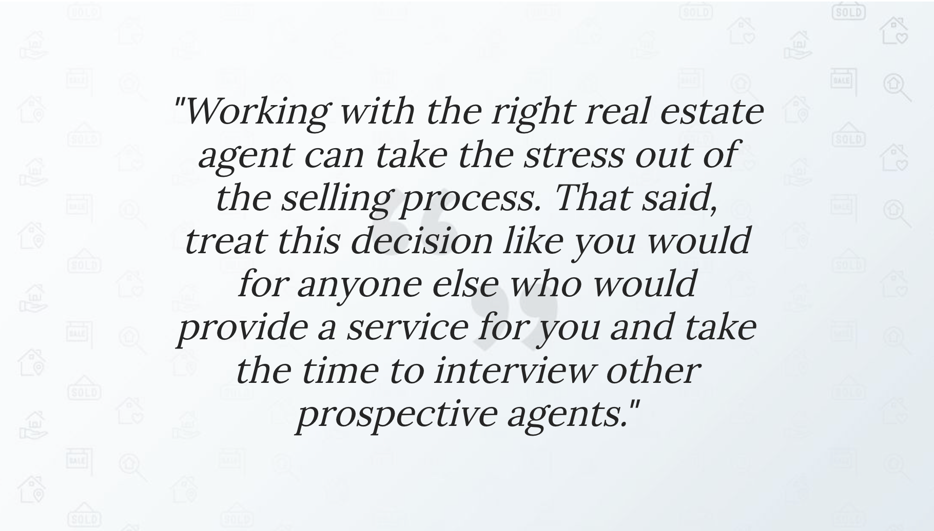 "Working with the right real estate agent can take the stress out of the selling process. That said, treat this decision like you would for anyone else who would provide a service for you and take the time to interview other prospective agents."